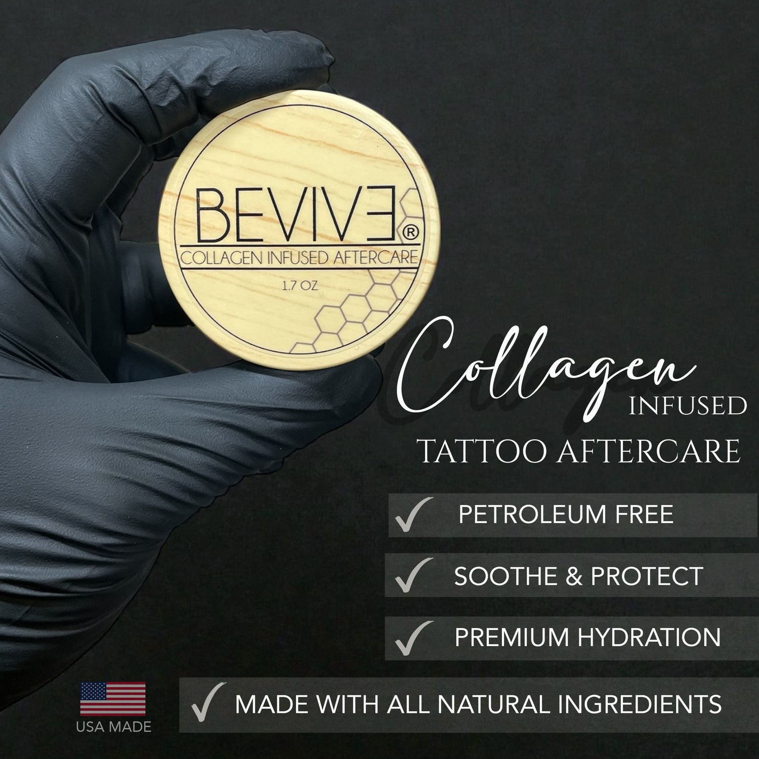 Heal and maintain your tattoos more effectively with our premium blend of all natural ingredients. From fine lines to heavily shaded pieces BEVIVE COLLAGEN INFUSED AFTERCARE will nourish your skin and enhance all of your ink.